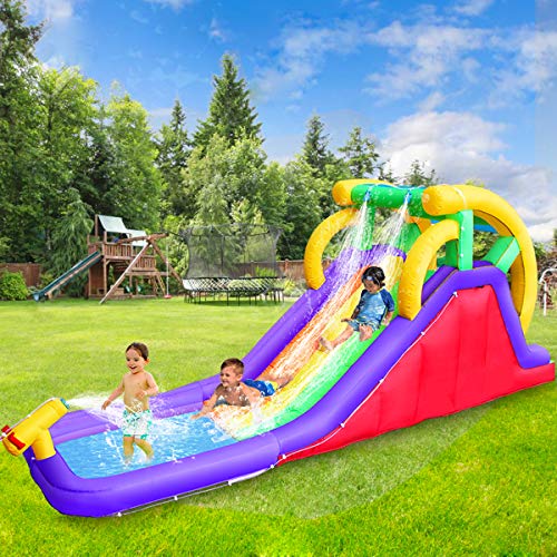 With a sprinkler system, it keeps you and your kids wet for most of the time. Kids and adults both are sure to be able to enjoy enjoy racing your friends or family members down the length of the slide, giving everyone a chance to prove who's the better slider. Setting your lawn water slide up in a low lying section of your yard could quickly turn the area into a mud pit. Part theme park, with a climbing wall. 5 best inflatable water slides for backyard in 2021. When you read the reviews below, keep these things in mind to help you choose the best inflatable water slide for your backyard. If you sincerely want to become the coolest parent on the block, you will want to consider investing in the best backyard water slide! They are custom made for having fun outside, doing the things you avoid placing it where standing water gathers. High quality commercial backyard giant big inflatable waterslide water pools slide for adults. The best summers are hot and sunny. Do not make a decision, until you've spent a few minutes reading this comprehensive guide! Finding the best backyard waterslide is a daunting task but they do exist. Tropical splash compact backyard water slide fits well for a small backyard, with inflated dimension (in feet), 12.5l x 5.5'w x 5.5'h.